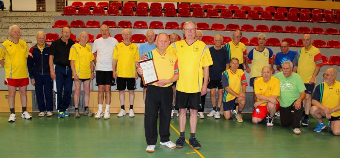 Die Lizenz-Übergabe fand damals in der Steuben-Kaserne statt, in der er seinen Dienst bei der Bundeswehr tat, da bei jenem Lehrgang zufällig mehrere Soldaten beteiligt waren. Da Hermann seiner Zeit die sportliche Leitung abgeben wollte, delegierte er diese Aufgabe an Harry, der uns seit dem freitags "bewegt". Diese Aufgabe wird von Harry nunmehr also seit 25 Jahren wahrgenommen. Unser EUMEL-Chef Gerd würdigte Harrys Einsatz in all den Jahren und überreichte ihm am 14.11.2014 eine Urkunde zu seinem 25jährigen "Dienstjubiläum" mit der Bitte um viele weitere Jahre Tätigkeit als Übungsleiter. Ein Blumenstrauß für seine Frau Annemarie durfte nicht fehlen, da sie uns Harry jeden Freitag zur "Verfügung" stellt.