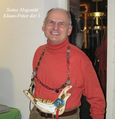 Nach dem Essen dankte Gerd Pries zunächst den beiden bereits genannten Organisatoren für die Vorbereitung und Durchführung und erteilte dann seiner Majestät dem amtierenden Kohlkönig Wolfram Joergler das Wort. Wolfram bemängelte zunächst den mangelnden Respekt, den ihm die EUMEL während seiner Regentschaft entgegengebracht hätten. Entgegen der bisherigen Regelung (alle bisherigen Kohlkönige wählen den neuen Kohlkönig) bat Wolfram nur das Präsidium mit ihm den neuen Kohlkönig zu bestimmen. Nach nur kurzer Beratung fiel die Entscheidung einstimmig für Klaus-Peter Stobbe. Bekanntlich wird bei uns nicht nur das ausgiebige Essen bewertet, sondern auch „die elegante Führung des Bestecks, das tadellose Benehmen bei Tisch, die gepflegte Konversation" und auch das Engagement bei den EUMELN. Wolfram gab dann schweren Herzens den Fressorden mit der Kette der bisherigen 26 Kohlkönige an Klaus-Peter ab und pfiff aber vorher noch 2 EUMEL zusammen, die es gewagt hatten, unmittelbar vor der Königsproklamation noch die Toiletten aufzusuchen. Klaus-Peter dankte bewegt für die große Ehre, die ihm zuteil wurde und bestellte eine Runde Raki. Auch Isi spendierte eine Runde und hoffte, dass es allen gut geschmeckt hat, was nur bejaht werden konnte. Von Harry wurde natürlich für jede Runde ein EUMEL-Tusch zelebriert, Fehler konnten trotz intensiver Beobachtung nicht festgestellt werden, offensichtlich trainieren einige EUMEL heimlich, damit ihnen im Falle eines Fehlers die nächste Runde erspart bleibt.