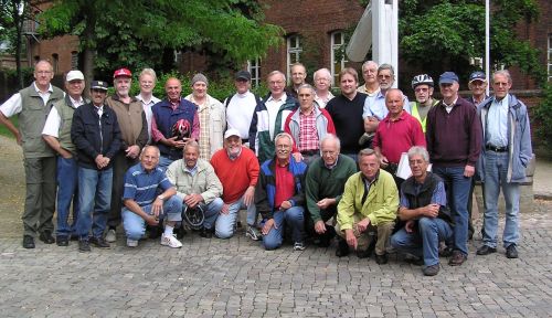 Die Tour hatte natürlich unser sportlicher Leiter Harry wieder organisiert, der dann nach dem obligatorischen Gruppen-Foto am Hungerbrunnen zum Aufsitzen aufforderte und das Feld anführte. Die Fahrt ging durch das Bauernviertel über Bierden, Uphusen Richtung Autobahn. An einem Stoppelfeld wurde ein Halt eingelegt, und Harry forderte die „ganz Harten" auf, barfuss über die Stoppeln zu laufen. Er selbst ging mit gutem Beispiel voran und es folgten ihm noch Rolf Endruschat, Norbert Olschewski und Heyko Spreckels.