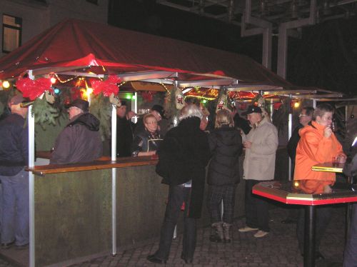 Herbert erlaubte uns auch die Zwischenlagerung bis zum Weihnachtsmarkt in seiner Werkstatt, somit war der Transport zum Bibliotheksplatz sehr kurz. Der Aufbau (incl. Dekoration) war unter der fachkundigen Leitung von Harry und Herbert in der Rekordzeit von drei Stunden erledigt, da 17 EUMEL tatkräftig mit anpackten. Bereits um 17:00 Uhr begann am Freitag die erste "Schicht" mit dem Standdienst, da der Bürgermeister die Eröffnung des Weihnachtsmarktes auf diesen Zeitpunkt festgesetzt hatte. Bereits die zweite "Schicht" konnte sich über Besuchermangel nicht beklagen, zumal die EUMEL nach dem Sport den Stand belagerten. Wider Erwarten waren wir gezwungen, bereits am Samstagabend Apfelwein nachzuordern, da die im November bestellte Menge schon verkauft war. Am Sonntag wurde nochmals Apfelwein und auch Calvados nachgekauft, da der Andrang an unserem Stand alle Erwartungen übertraf, und gegen Ende des Marktes waren wir ausverkauft! In beiden Zeitungen wurde am Sonntag und am Montag über den Weihnachtsmarkt positiv berichtet, und dabei besonders auf unser EUMELELIXIER in Wort und Bild hingewiesen.