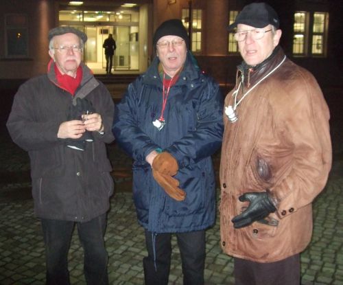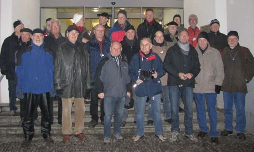 Die Kohl- und Pinkel-Organisatoren Manfred Stecher und Klaus-Peter Stobbe hatten in diesem Jahr einen Monat früher zu der Tour geladen als im letzten Jahr. 25 EUMEL hatten sich in die Teilnehmerliste eingetragen, von denen einer den Termin wohl verschlafen hatte. Nach dem obligatorischen Foto im Eingang der Sparkasse ging der Marsch zum Bahnhof los, um dort den ersten Stärkungsschluck zu nehmen.
