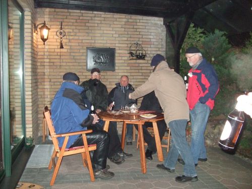 An der Eisenbahn ging es weiter, durch das Schulzentrum zu Stechers in den Noldeweg, wo Ruth und Manni auf der Terrasse zur Stärkung reichlich Schmalzbrote, Frikadellen, Kräcker und Bier anboten. Es wurde geäußert, dass man bereits vor dem eigentlichen Kohl- und Pinkel-Mahl gesättigt sei. Auch wenn Manni Gastgeber war, so mahnte er doch zum Aufbruch, da er in dem noch unbekannten Gasthof das Essen zu einer bestimmten Zeit bestellt hatte.