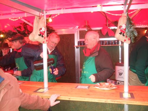 Aus organisatorischen Gründen konnte der Stand erst am 09.12.2011 aufgebaut und komplett eingerichtet werden. Der Aufbau ging wieder zügig vonstatten, da die Aufbautruppe unter Leitung von Harry und Herbert meistens sehr diszipliniert arbeitete. Die erste Schicht konnte somit gegen 18:00 Uhr mit dem Ausschank beginnen und hatte auch gleich gut zu tun, denn die ersten Besucher wollten natürlich unser "EUMELELIXIER", den bekannten heißen Apfelwein mit oder ohne Calvados probieren.