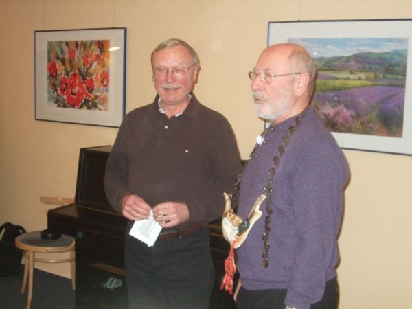 Endlich zogen sich die bisherigen Kohlkönige zurück, um den neuen König 2012 zu ermitteln. Die Wahl fiel nach kurzer Diskussion auf einen EUMEL, der seit ca. 35 Jahren dabei ist und regelmäßig die Sportabende besucht. Gerd schlenderte mit launigen Worten durch die Runde und erwähnte dabei, wie sich ein künftiger Kohlkönig verhalten haben sollte bzw. wie er zum Sport/Turnen steht. Wichtig ist natürlich auch, dass er beim Kohl-Essen mit Messer und Gabel umgehen kann. Alle lauschten gespannt seinen Worten, bis er endlich Horst Fischer unter Beifall der Anwesenden das Zeichen der Würde, die Kette mit dem Knochen, umhängte. Horst bedankte sich für die "hohe Auszeichnung" und bestellte sofort eine Runde "Roten" und versprach, in diesem Jahr ein würdiger König sein zu wollen, wofür er von Harry den obligatorischen EUMEL-Tusch bekam.