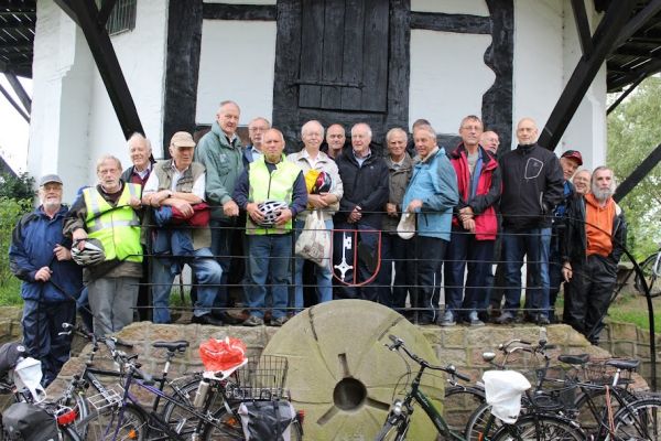 Obwohl die Ferien erst am 23.7.2012 beginnen, fand unsere traditionelle Fahrradtour vor den Ferien in diesem Jahr schon eine Woche früher statt, da Harry eine Woche später bereits an dem Landesturnfest in Osnabrück teilnimmt, denn als der Organisator dieser Tour muss er natürlich dabei sein. Mit 27 EUMELN ging die Tour zunächst über den neuen Kreisel in die Marsch, wo es leider anfing zu regnen. Nachdem die "Regenklamotten" angezogen waren, ging es weiter über den Hof des Hirtenhauses zur Mühle. Dort bat Harry die Fahrräder abzustellen und in die Mühle zu kommen.