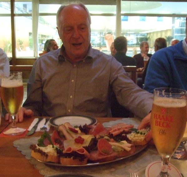 Gerd hielt eine seiner kürzesten Reden und bedankte sich bei Harry für die Organisation, indem er schlicht und ergreifend danke sagte. Aus diesem Grunde wurde der erste EUMEL-TUSCH von Helmut für Harry als Dank zelebriert. Die erste Runde "Roter" ließ nicht lange auf sich warten, da Klaus Beermann am 9.7.2012 seinen 70. Geburtstag feierte. Die beiden EUMEL-TUSCHS für Jürgen und Klaus übernahm Harry natürlich wieder in altbewährter Manier.