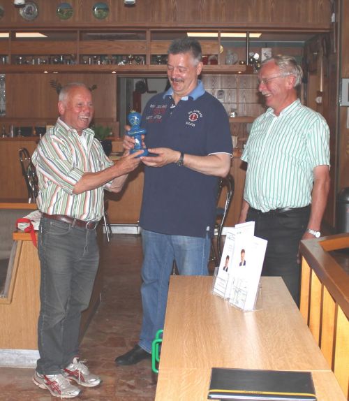 Unser EUMEL-Chef Gerd bedankte sich im Namen der EUMEL bei Harry für die in diesem Jahr trotz der erwähnten Schwierigkeiten organisierte Radtour, die bei allen Teilnehmern großen Anklang fand. Da Dieter sein Lokal künftig aufgeben wird, dankten Gerd und Harry ihm für 37 Jahre, die er und seine Mitarbeiterinnen uns freitags bedienten und wünschten ihm für die Zukunft alles Gute. Als Dank überreichte Harry ihm einen selbstgefertigten "EUMEL" zur Erinnerung. Dieter bedankte sich ebenfalls für die gute "Zusammenarbeit" und spendierte uns zum Schluss noch eine Runde "Jubi".