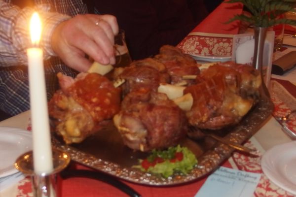 Fast pünktlich um 18:00 Uhr wurde das Essen serviert. Die angeregten Gespräche verstummten, denn fast jeder (einige Teilnehmer schaffen die riesige Portion nicht mehr und bestellen sich andere Gerichte) war mit seiner Haxe beschäftigt. Auch in diesem Jahr war wieder die einhellige Meinung, dass es an dem Essen absolut nichts auszusetzen gab.