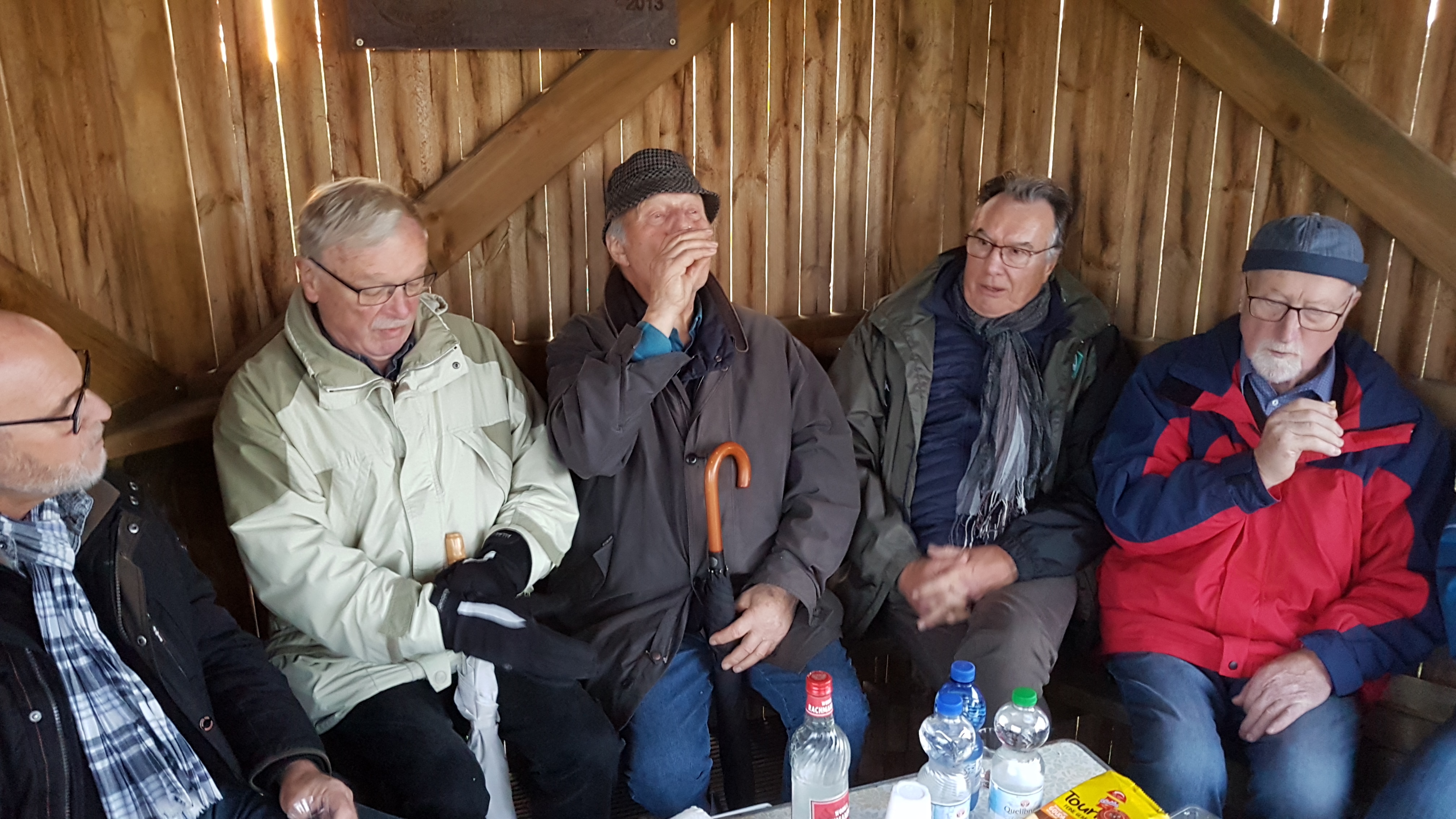 Die Wanderer hatten befürchtet, dass die Wanderung der schlechten Witterung wegen hätte ausfallen müssen, doch der Himmel klarte gegen 15:00 Uhr auf, und es war kein weiterer Regen zu erwarten. Die kleine Gruppe von 10 Teilnehmern (+1 in Bierden) setzte sich nach dem obligatorischen Foto und der von dem neuen Radfahrer-Chef Heiner Ellmers verabreichten Stärkung unter Leitung von Herbert Förster gegen 15:30 Uhr in Bewegung. Unser ältester EUMEL, Siegfried Pein, gehörte natürlich trotz seiner inzwischen 87 Jahre wieder zu den Wanderern. An der Schutzhütte bei Clüverswerder wartete Heiner dann erneut auf die Gruppe und spendierte zur weiteren Stärkung noch einen Schluck. Angeblich soll es einigen Wanderern in der Schutzhütte so gut gefallen haben, dass sie am liebsten dort geblieben wären.