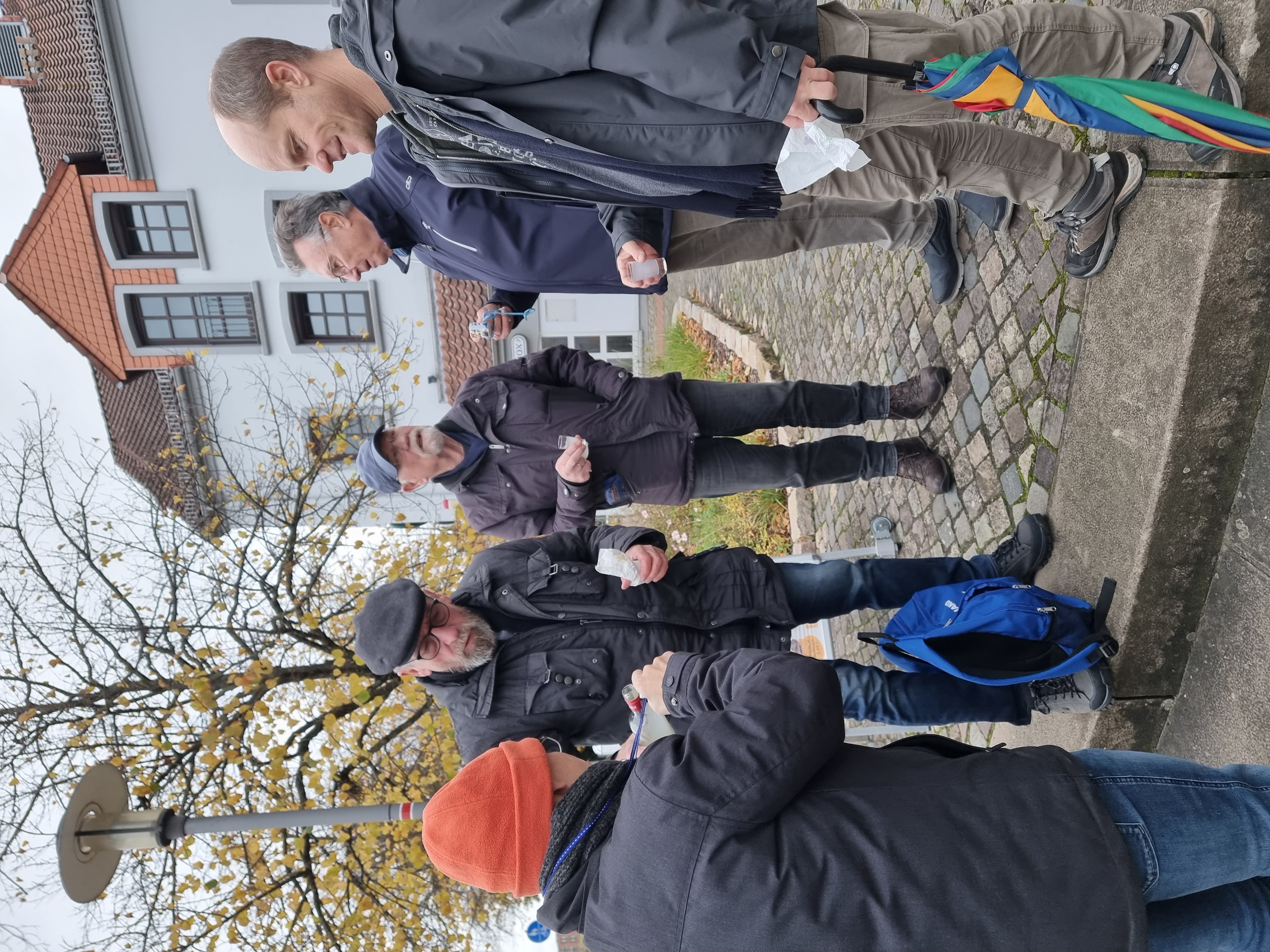Heiner hatte in der Zwischenzeit alles gut vorbereitet. Ein Tisch war aufgestellt, heißer Kaffee war reichlich vorhanden, Tassen standen bereit, viel Knabberzeug lud uns ein; wir wollten Heiner nicht enttäuschen und putzten alles weg. Kurz vor dem Abmarsch fing es an zu regnen; die Wanderer und Radler machten sich regenfest. Ich (Siegfried) half Heiner beim Einpacken und fuhr mit nach Uesen. Wir luden alles aus, und Heiners Sohn Dirk stieg zu uns ins Auto und fuhr uns nach Bollen. Dort versprach er, uns auch wieder abzuholen, wenn wir es wollten. Die Wanderer, Radfahrer und weitere Teilnehmer waren schon in Bollen angekommen, sie hatten die Treffpunktzeit gut eingehalten. Einige waren innen und außen recht feucht.