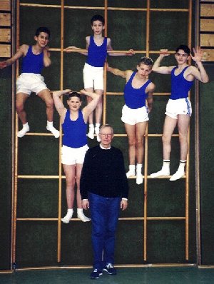 ![]() | ![]() oben links Hermann in der Realschulturnhalle unten links Hermann beim Deutschen Turnfest mit Eumeln oben Hermann mit Realschülern bei "Jugend trainiert für Olympia" |