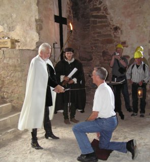 18.8.: Stadtführung durch Cesis mit Burgruine, Schlossgarten, Gymnasium (dorthin spenden wir seit Jahren für Deutschbücher, und Gerd übergab auch vor Ort wieder eine Spende, für die sich Herr Zemits herzlich bedankte.) Sehr beeindruckend war die neue großzügige Turnhalle. Nachmittags Fahrt nach Pieskalni und Besichtigung der Gauja-Felsschlucht "Ergulu klinfis". Gegen Abend Besichtigung der Burg in Cesis mit "Ritterspielen" (Speerzielwurf und Stelzenlauf im Gras). Als Sieger wurde Horst Kunke vom "Meister" im Burgturm zum Ritter Horst geschlagen. Ein zünftiges Rittermahl, leider mit Besteck, rundete den Tag ab.