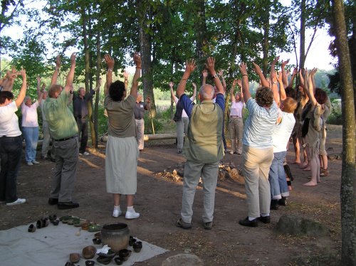 Eumel am Gut UngurmuiziaWeiterfahrt zur Inselsiedlung von Araisi (lettgallisches Wehrdorf im See). Krönender Abschluss in der "Steinzeit" mit seinen "Ureinwohnern" und ihren Tänzen, Stockbrot mit Honig und auf heißen Steinen in der Sandgrube gegartem Fisch. Annemarie und Vinzenz werden zu Mama und Papa des Stammes gewählt. Rückfahrt zum Hotel. Gerd bedankt sich im Namen der Gruppe bei Herrn Zemitis für die 4 Tage seiner Führung und ernennt ihn unter großem Beifall zum Ehren-EUMEL.