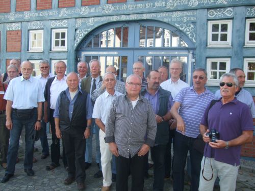 Samstag: Nach einem üppigen Frühstück, welches Annemarie und Annette den Jedermännern anboten, ging es vormittags mit dem Zug nach Verden. Dort trafen wir unseren Stadtführer im Domherrenhaus. Es wurde ein wenig von der Geschichte Verdens mit Ober- und Unterstadt berichtet und schon das erste Gewölbe aus alten Zeiten gezeigt. In der Krypta des Doms konnten alte Inschriften auf Türbogen bewundert werden. Hier wird gleichzeitig der Toten der Weltkriege gedacht.