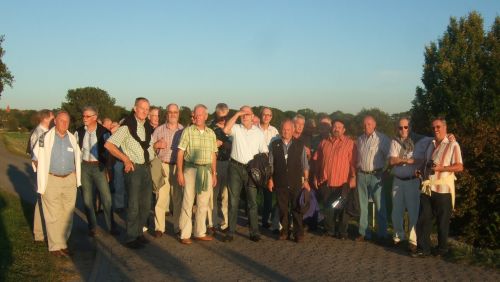 Die Koffer wurden in die bereitstehenden Autos verladen, und die Jedermänner wurden von den EUMELN in die Pension Dohrmann im Philosophenweg begleitet. Gerd informierte kurz über den weiteren Tagesablauf. Um 18:00 Uhr standen dann 18 EUMEL bei der Pension bereit, um die Jedermänner zum Spaziergang nach Bierden abzuholen. Die 3 Bierdener, Gerd, Klaus-Peter und Hajo stießen erst in Bierden noch dazu. Harry hatte das Kommando und führte die Truppe auf dem Deich entlang bis zu Meyer´s Gasthof, weiter durch den Deichschart, hinter dem Deich bis zum Corporalsdeich und dann wieder zum Gasthof, wo das Abendessen bestellt war.