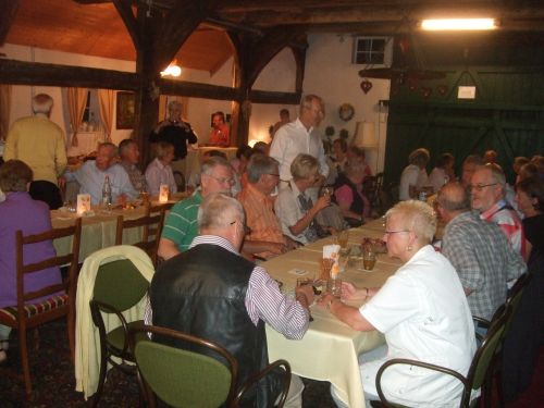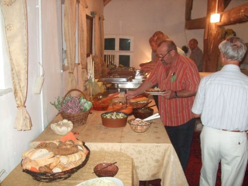 Gegen 19:00 Uhr fand dann der gemütliche Abend auf der Diele von Gertrud und Georg (genannt Schorse) Osmers statt, bei dem auch die Damen der EUMEL traditionsgemäß "zugelassen" waren. Gerd begrüßte nochmals die Jedermänner sowie die EUMEL-Damen und bedankte sich bei den Helferinnen und Helfern, die dieses insgesamt 16. Treffen zwischen den Jedermännern und EUMELN mit organisiert haben. Ein besonderer Dank galt natürlich auch Gertrud und Schorse, die ihre Diele nun schon zum 2. Male zur Verfügung stellten. Endlich wurde das Kalt-Warme-Buffet eröffnet, und den Gästen wurde der Vortritt gelassen, denn vor Jahren gab es dieser halb vor einigen Jahren mal "Schwierigkeiten", wie sich einige EUMEL sicher noch erinnern werden. Das leckere Essen war in keiner Weise zu beanstanden, was von allen Teilnehmern lobend erwähnt wurde.