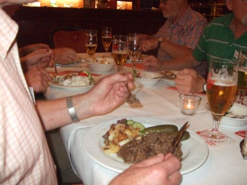 Unterwegs erklärten Harry und weitere EUMEL einige interessante Dinge, die den Hochwasserschutz erforderlich machten. Im sogenannten Spiegelsaal wurde dann das erste Bier geordert und EUMEL-Chef Gerd begrüßte die Jedermänner nochmals ganz herzlich zum 8. Besuch in Achim seit 1985 und wünschte ein gemeinsames erlebnisreiches Wochenende. Als dann das Essen, Knipp bzw. Hering mit Bratkartoffeln, aufgetragen wurde, kehrte zunächst etwas Ruhe ein, denn alle waren mit dem Essen beschäftigt.