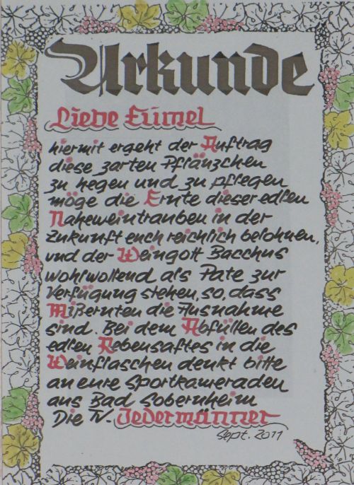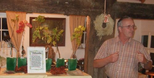 Nach dem Essen bedankte sich Gerhard Melcher im Namen der Jedermänner für die Einladung zu dem Treffen und dem bisherigen Verlauf und übergab, trotz der vereinbarten Absprache, keine Gastgeschenke mehr auszutauschen, unserem Gerd einige Rebstöcke, mit der urkundlichen Verpflichtung, die Pflänzchen zu hegen und zu pflegen, damit sie künftig reichlichen Ertrag bringen mögen. Der gesamte Inhalt der Urkunde kann auf unserer Internetseite nachgelesen werden. Auch der stellvertretende Bürgermeister der Stadt Bad Sobernheim, der Jedermann Alois Bruckner, richtete einige Worte an uns und überbrachte die Grüße des Bürgermeisters. Zu vorgerückter Stunde erhielt Harry von einem EUMEL den Auftrag, den EUMEL-Tusch zu zelebrieren, was er in seiner bekannten zackigen Art auch sofort in die Tat umsetzte. An dieser Stelle sei auch den fleißigen Helfern hinter der Theke gedankt, die sehr aufmerksam für die Getränke sorgten. Dieser harmonisch verlaufene Abend wird sicher allen Teilnehmern noch lange in Erinnerung bleiben.