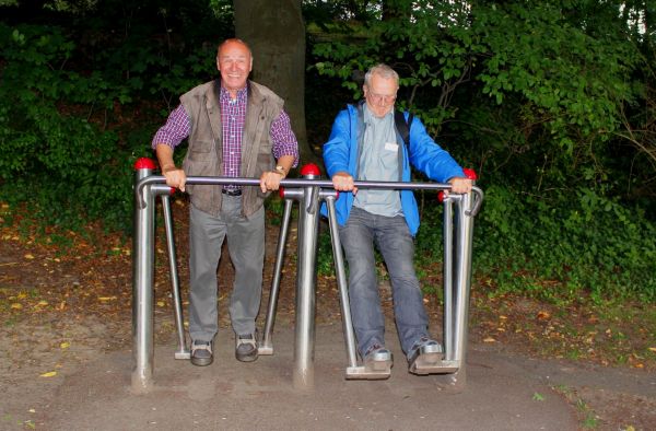 Um 17:15 Uhr wurde von Harry und Gerd zum Aufbruch geblasen, denn es sollte nach einer kurzen Wanderung bei Abo im "Restaurant im Hallenbad" das Abendessen eingenommen werden. Einige EUMEL beteiligten sich ebenfalls an der Wanderung. Unterwegs wurden bereits einige interessante Unterhaltungen geführt und Neuigkeiten aus beiden Vereinen ausgetauscht. Einen Zwischenstopp legte Harry im früheren Rathauspark ein, denn dort wurden an den von der Bürgerstiftung aufgestellten Geräten zur Auflockerung einige nützliche übungen absolviert. Gegen 18:30 Uhr gesellten sich dann weitere EUMEL zu der Gruppe, um nach dem gemeinsam vorbestellten Essen in freundschaftlicher Runde zu klönen und Erinnerungen auszutauschen. Nach der von Abo spendierten Runde wurde von Harry natürlich in bewährter Manier der EUMEL-Tusch zelebriert, der von den Jedermännern inzwischen ebenfalls beherrscht wird. Es wurde sogar festgestellt, dass kein Fehler begangen wurde, denn das wäre einem Übeltäter aufgrund der 41 anwesenden Jedermänner und EUMEL teuer zu stehen gekommen.