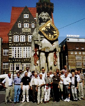 ![]() | Am Sonntagmorgen um 9:00 Uhr wurde das Gepäck verladen, und wir fuhren wiederum mit Privat-Autos zum Bremer Flughafen, stellten die Autos dort ab und fuhren mit der Straßenbahn in die Innenstadt. Bei einem Spaziergang durch das Schnoorviertel wusste Jürgen erstaunliche Einzelheiten über dieses alte Bremer Viertel zu berichten. Nach einem Gruppenfoto unter dem Roland (links) war Frühschoppen an der Schlachte im "Paulaner Biergarten" angesagt. |