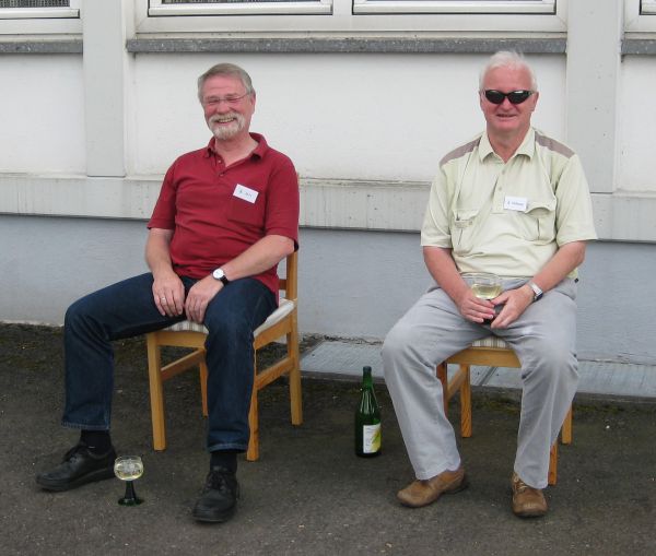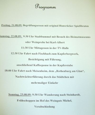 Nach einer siebeneinhalbstündigen Busfahrt trafen wir gegen 18:30 Uhr am Fliegerheim in Bad Sobernheim ein und wurden von den Jedermännern mit einem kräftigen "Radau" begrüßt. Nach der sehr herzlichen Begrüßung durch den langjährigen "Chef" der Jedermänner Gerhard Melcher und dem stellvertretenden Bürgermeister (auch ein Jedermann) fanden die ersten Gespräche beim traditionellen Schluck Wein statt bevor die Zimmerverteilung vorgenommen wurde. Zur Stärkung wurde uns dann ein sehr schmackhaftes Essen mit original Hunsrücker Spießbraten serviert und danach wurden beim köstlichen Wein viele Erinnerungsgespräche über frühere Treffen geführt, denn 1985 fand die erste Begegnung in Sobernheim statt. Als Symbol für die langjährige Freundschaft überreichte unser Gerd dem Gerd der Jedermänner ein Bäumchen, das hoffentlich bald Früchte (Äpfel) tragen wird.