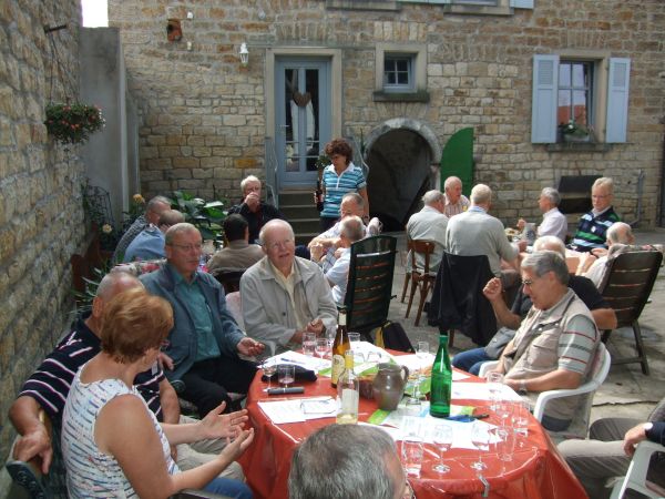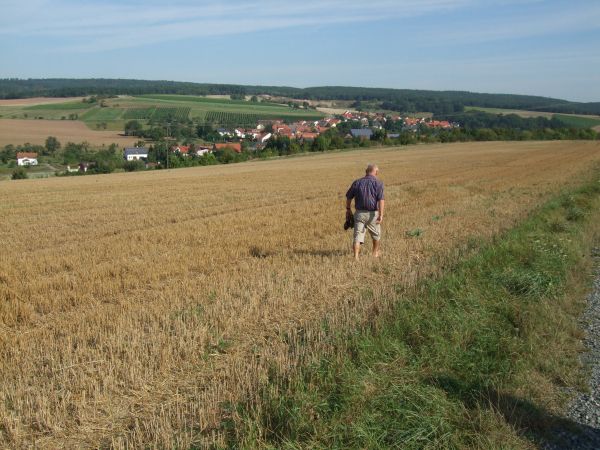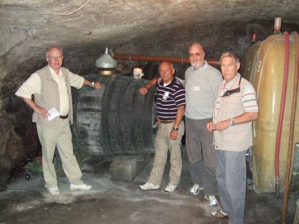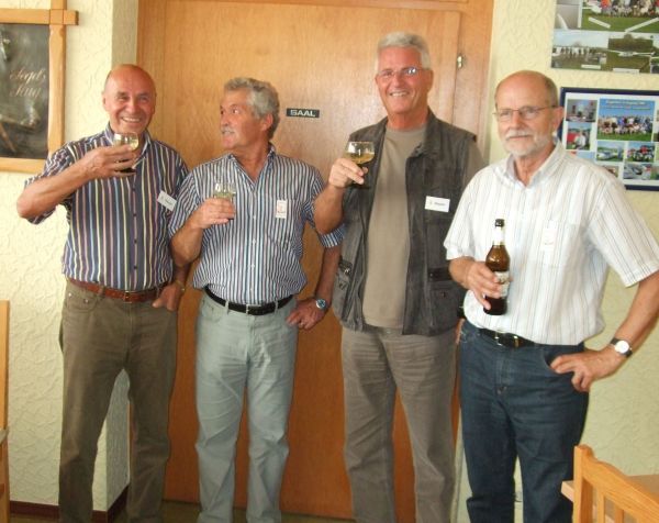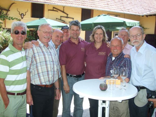 Der Sonntagmorgen Begann wieder traditionell mit der Wanderung nach Steinhardt, wo wir zunächst auf dem Hof des Weingutes Michel (Otto war Jedermann und ist leider verstorben) mit einem Glas „Mi Secco" (= Michel Secco, Prosecco ist bekanntlich das italienische Pendant) empfangen wurden. Otto´s Sohn Thomas und seine Frau Martina hießen uns herzlich willkommen und luden zu einer zünftigen Brotzeit und diversen Schoppen Wein ein. Harry zelebrierte mit den EUMELN als Dank für die Bewirtung sofort den traditionellen "EUMEL-TUSCH", den auch die meisten Jedermänner inzwischen beherrschen. Nach der Verabschiedung durch Gerhard Melcher nahmen wir wieder einmal Abschied von unseren Freunden aus Bad Sobernheim und freuen uns auf deren Besuch in Achim im Jahre 2011.
