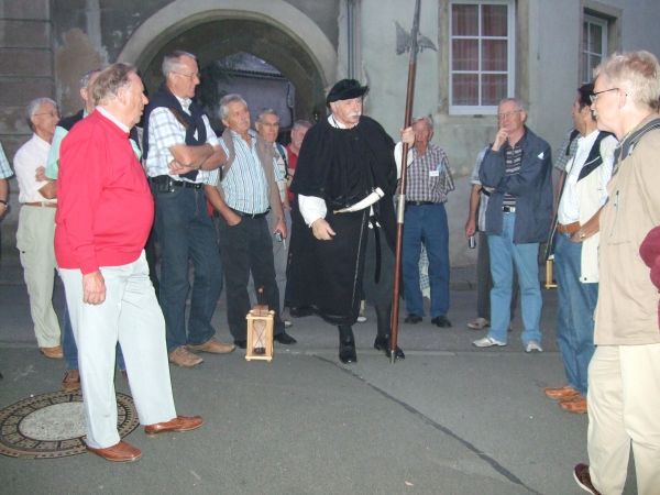 Gegen Abend fuhren wir dann nach Meisenheim, um an einer eigens für uns organisierten Nachtwächterführung teilzunehmen. Der Nachtwächter, ein pensionierter Architekt, führte uns durch die historische Altstadt Meisenheims und erzählte auf originelle und unterhaltsame Art Anekdoten und vieles zu der bedeutenden Geschichte der Stadt und des Herzogtums zu Pfalz-Zweibrücken aus vier Jahrhunderten. Zu jeder vollen Stunde brachte er die althergebrachten Meisenheimer Nachtwächtergesänge zu Gehör. Unterbrochen wurde die Führung durch ein Drei-Gänge-Menü, wobei jeder Gang des Menüs in einem anderen Restaurant eingenommen wurde. Diese Nachtwächterführung ist an Originalität kaum zu überbieten.
