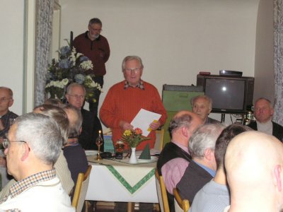 ![]() Helmut Mirbach begrüßt die Anwesenden. | Helmut Mirbach berichtet: Nach einer 2-stündigen Wanderung durch die Wesermarsch erreichten 32 Altersturner und Eumel bei heftigem Schneetreiben und starken Regengüssen den Landgasthof von Hansi Mühlenbruch in Bollen. Mit einem fröhlichen Lied, "Im Krug zum grünen Kranze" begann der feucht, fröhliche Abend. Ein fachkundiger Filmvortrag über Bienen und Bienenzucht wurde von Hartmut Borchert und Harald Hochfeld vorgetragen. Danach folgte ein großzügiges Eisbeinessen mit Sauerkraut und diversen Fleischsorten zum Sattessen. Die nötigen geistigen Getränke sorgten im Magen für das wohltuende und nicht belastende Wohlbefinden. Bei Gesang und heiteren Erzählungen verlief der Abend wie im Fluge. Die Heimfahrt erfolgte in Sammeltaxen. Der harte Kern der Teilnehmer ließ es sich aber nicht nehmen, den Heimweg nach Achim auf "Schusters Rappen" zu wandern. |