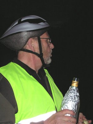 Inzwischen war die gerissene Kette des Fahrrades von Holger Kup auch wieder repariert, und so konnte die Radtour fortgesetzt werden. Die Tour ging Richtung Weserbrücke, aber nahe des ehemaligen Oelhafens riss Holgers Kette abermals, somit musste er endgültig aufgeben und hat sich von seiner Frau abholen lassen. Unsere Fahrt ging über die Weser Richtung Thedinghausen zu Hermann Knief, der uns in seinem großen Garten samt seiner Familie empfing. Natürlich gab es wieder erfrischende Getränke und etwas zum Essen. Hermann hatte einen Schlachter engagiert, der auf einem tollen Grill Spießbraten zubereitete und dann zum Stillen des Hungers der EUMEL mit Salat und Bratkartoffeln bereitstellte. Die einhellige Meinung der Teilnehmer war, dass das Essen sehr gut zubereitet war und allen gut geschmeckt hat. Harry gab den Verdauungsschnaps in Form eines Kümmerlings aus, da er am 6.7.2005 seinen 62. Geburtstag feierte. Der obligatorische EUMEL-Tusch ließ natürlich nicht lange auf sich warten, zelebriert von dem Vertreter des Vertreters. Harry selbst rief dann zu einem weiteren EUMEL-Tusch für Hermann und seine gesamte Familie auf, die sich bei der Ausgestaltung des Abends sehr viel Mühe und Arbeit gemacht haben. Ein weiterer Tusch galt Gerd Kruse für seine Bewirtung und den Vortrag. Fehler beim EUMEL-Tusch konnten bei den 33 EUMELN, von einer kleinen Ausnahme abgesehen, nicht festgestellt werden. Gegen 22:15 Uhr setzten wir uns dann wieder auf die Drahtesel, um in die heimatlichen Gefilde zurückzufahren. An der Eyterbrücke wurde nochmals ein Zwischenstopp eingelegt; denn Jürgen Scheler wollte noch unbedingt seinen „Selbstgebrannten" ausgeben, der ihm auch ausgezeichnet gelungen war. Den ihm dafür gebührenden EUMEL-Tusch wird er aber erst nach den Sommerferien erhalten, da die Situation für eine solche „Handlung" absolut nicht geeignet war. Es konnte festgestellt werden, dass EUMEL auch bei völliger Dunkelheit trinken können.