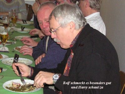 Nach dem Essen dankte Gerd Pries zunächst den beiden bereits genannten Organisatoren für die Vorbereitung und Durchführung und erteilte dann seiner Majestät dem amtierenden Kohlkönig Wolfram Joergler das Wort. Wolfram bemängelte zunächst den mangelnden Respekt, den ihm die EUMEL während seiner Regentschaft entgegengebracht hätten. Entgegen der bisherigen Regelung (alle bisherigen Kohlkönige wählen den neuen Kohlkönig) bat Wolfram nur das Präsidium mit ihm den neuen Kohlkönig zu bestimmen. Nach nur kurzer Beratung fiel die Entscheidung einstimmig für Klaus-Peter Stobbe. Bekanntlich wird bei uns nicht nur das ausgiebige Essen bewertet, sondern auch „die elegante Führung des Bestecks, das tadellose Benehmen bei Tisch, die gepflegte Konversation" und auch das Engagement bei den EUMELN. Wolfram gab dann schweren Herzens den Fressorden mit der Kette der bisherigen 26 Kohlkönige an Klaus-Peter ab und pfiff aber vorher noch 2 EUMEL zusammen, die es gewagt hatten, unmittelbar vor der Königsproklamation noch die Toiletten aufzusuchen. Klaus-Peter dankte bewegt für die große Ehre, die ihm zuteil wurde und bestellte eine Runde Raki. Auch Isi spendierte eine Runde und hoffte, dass es allen gut geschmeckt hat, was nur bejaht werden konnte. Von Harry wurde natürlich für jede Runde ein EUMEL-Tusch zelebriert, Fehler konnten trotz intensiver Beobachtung nicht festgestellt werden, offensichtlich trainieren einige EUMEL heimlich, damit ihnen im Falle eines Fehlers die nächste Runde erspart bleibt.