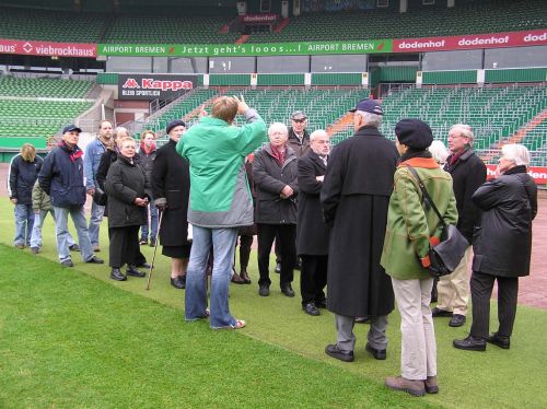 Während der diesjährigen Matinee besuchten wir das Weser-Stadion, von dem die meisten "Fans" nur den Innenraum mit dem Spielfeld kennen. In 2 Gruppen erklärten uns die beiden Stadionführer zunächst in den Business-Logen etwas über die Geschichte des SV Werder Bremen und all seine tollen Erfolge. Im Jahre 2003 wurden die Lizenzspielerabteilungen aus dem Verein ausgegliedert und als Werder Bremen GmbH & CO KGaA weitergeführt, die im letzten Geschäftsjahr einen Umsatz von über 1 Million € erzielte. Getestet wurde natürlich auch, wie viele Werder-Fans bei den EUMELN vorhanden sind, es gab allerdings auch Fans von anderen Bundesliga-Clubs!