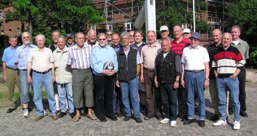Traditionsgemäß trafen wir uns am letzten Freitag vor den Sommerferien wieder zu unserer Radtour, die von Harry organisiert wurde. Eine Überprüfung der Fahrräder konnte von Norbert nicht vorgenommen werden, da die erforderlichen Plaketten nicht zur Verfügung standen. Nachdem auf dem Baumplatz das obligatorische Gruppenfoto geschossen war, blies Harry zum Aufbruch der 25 erschienenen EUMEL. Wir überquerten zunächst den Bibliotheksplatz, wo auch die Schützen zur Eröffnung ihres 150-jährigen Schützenfestes antraten, und die zahlreich anwesenden Besucher nahmen uns interessiert zur Kenntnis. Die Fahrt ging dann an der Bahnlinie entlang nach Uphusen und über Clüverswerder wieder zurück nach Achim. Bei einem Autohaus im Industriegebiet "Auf den Mehren" erklärte uns der Geschäftsführer einige interessante Dinge über den Handel mit gebrauchten Nutzfahrzeugen, anschließend informierte uns der Inhaber der Firma über den Handel und die Verschrottung von PKWs und zeigte uns diesen Teil seiner Firma, der an einem getrennten Standort aber in der selben Straße liegt. Die Fahrt ging dann weiter zum Schützenplatz, da wir dort an dem Zapfenstreich der Schützen teilnehmen wollten. Hintergrund war, dass unser Verein in 3 Jahren ebenfalls sein 150-jähriges Jubiläum feiert, und wir uns dann über die Teilnahme z. B. auch der Schützen sehr freuen würden. Nach dem Zapfenstreich ging es weiter zu "Dieter im Hallenbad", denn inzwischen war doch der Hunger bzw. der Appetit sehr groß. Nach dem ersten Bier gab es reichlich Schnittchen, die von Dieter und seiner Mannschaft wieder hervorragend zubereitet waren. Harry wurde für die Organisation der diesjährigen Radtour von unserem EUMEL-Chef Gerd gedankt und der "Vertreter des Vertreters" zelebrierte ihm einen zünftigen EUMEL-Tusch.