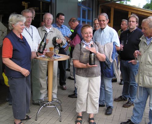 Nach dieser Härteprüfung ging es weiter über die Autobahn, durch die Weiden neben dem Oyter See, Richtung Embsen, Borstel und in Uesen wieder über die Autobahn. Im Gewerbepark Uesen erfolgte der Stopp bei der Firma SOILTEC-GREENFIX, die von dem ehemaligen Fußballer Günter Birkenfeld gegründet und jetzt von seinem Sohn Günther mit der Erweiterung um einige Geschäftsbereiche geführt wird. Zur Begrüßung gab es zunächst ein Gläschen Sekt, den uns unsere Freunde aus Bad Sobernheim bei ihrem Besuch im letzten Jahr mitgebracht hatten. Annemarie Kurth und Giesela Spreckels traten dabei einmal mehr als fleißige Helferinnen auf. Herr Birkenfeld begrüßte dann die EUMEL und berichtete über Gründung und Entwicklung der Firma, die sich mit dem Vertrieb von Geozellen befasst, die in vielfältiger Form im Garten, beim Deich- und Straßenbau eingesetzt werden können. Anhand von Musterflächen konnten wir uns von der Vielfalt der Einsatzmöglichkeiten ein Bild machen. Eine kurze Filmvorführung zeigte, wo und wie die Geozellen bisher bereits eingesetzt wurden. Harry dankte zum Schluss dem Ehepaar Birkenfeld für die Information und die Gastfreundschaft und rief zur Weiterfahrt zu "Dieter im Hallenbad" auf.