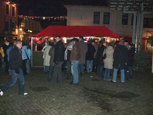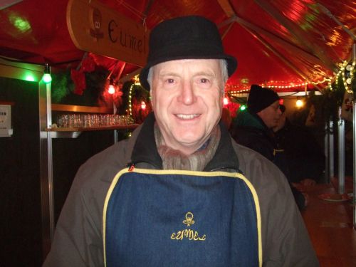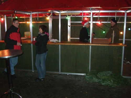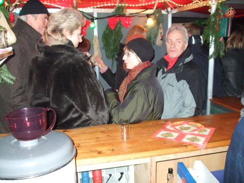 Herbert erlaubte uns auch die Zwischenlagerung bis zum Weihnachtsmarkt in seiner Werkstatt, somit war der Transport zum Bibliotheksplatz sehr kurz. Der Aufbau (incl. Dekoration) war unter der fachkundigen Leitung von Harry und Herbert in der Rekordzeit von drei Stunden erledigt, da 17 EUMEL tatkräftig mit anpackten. Bereits um 17:00 Uhr begann am Freitag die erste "Schicht" mit dem Standdienst, da der Bürgermeister die Eröffnung des Weihnachtsmarktes auf diesen Zeitpunkt festgesetzt hatte. Bereits die zweite "Schicht" konnte sich über Besuchermangel nicht beklagen, zumal die EUMEL nach dem Sport den Stand belagerten. Wider Erwarten waren wir gezwungen, bereits am Samstagabend Apfelwein nachzuordern, da die im November bestellte Menge schon verkauft war. Am Sonntag wurde nochmals Apfelwein und auch Calvados nachgekauft, da der Andrang an unserem Stand alle Erwartungen übertraf, und gegen Ende des Marktes waren wir ausverkauft! In beiden Zeitungen wurde am Sonntag und am Montag über den Weihnachtsmarkt positiv berichtet, und dabei besonders auf unser EUMELELIXIER in Wort und Bild hingewiesen.