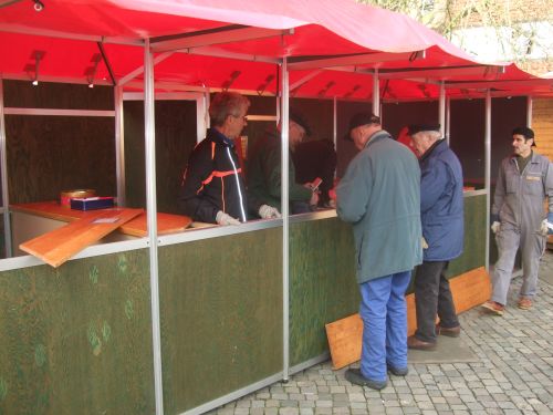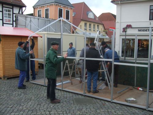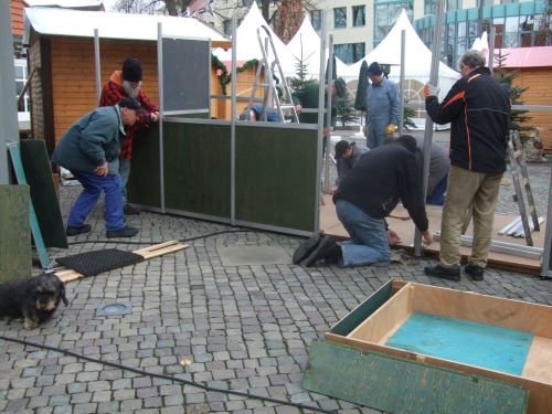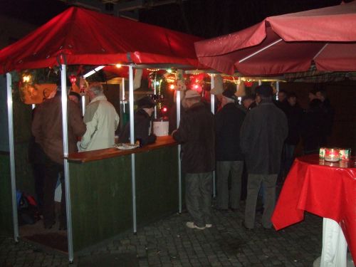 Aus organisatorischen Gründen konnte der Stand erst am 09.12.2011 aufgebaut und komplett eingerichtet werden. Der Aufbau ging wieder zügig vonstatten, da die Aufbautruppe unter Leitung von Harry und Herbert meistens sehr diszipliniert arbeitete. Die erste Schicht konnte somit gegen 18:00 Uhr mit dem Ausschank beginnen und hatte auch gleich gut zu tun, denn die ersten Besucher wollten natürlich unser "EUMELELIXIER", den bekannten heißen Apfelwein mit oder ohne Calvados probieren.
