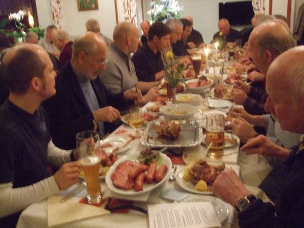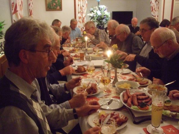 ![]() | Und das berichtet EUMEL-Chef Gerhard Siebke Am 3. November war es wieder so weit. Die Altersturner/Radfahrer hatten eingeladen. Die Mehrheit kommt mittlerweile von Eumeln, was ein bisschen daran liegt, dass ältere Eumel nicht Altersturner werden wollen, sondern bis ins hohe Alter Eumel bleiben. Das hielt insgesamt 31 Teilnehmer nicht davon ab nach Bollen zu kommen. Die 22 Wanderer sind hierbei besonders zu erwähnen, da sie trotz dauerndem Nieselregen zu Fuß anreisten. Zum Glück war kaum Wind, sodass unterm Schirm nur die Schuhe nass wurden und alle in guter Stimmung nach 10 Kilometern das Ziel erreichten. Nach der Begrüßungsansprache von Mannie, mehreren Liedern und ein paar Bieren wurden die Haxen serviert. Diese waren wie immer hervorragend. Es gab nur einen dessen Hunger erst nach Verzehren der 2. Haxe gestillt war. Zudem war für alle noch Wurst und Kasslerfleisch im Angebot. Nach vielen guten Gesprächen und dem Absingen von weiteren Liedern gingen und fuhren alle nach dem schönen Abend wieder nach Hause. |