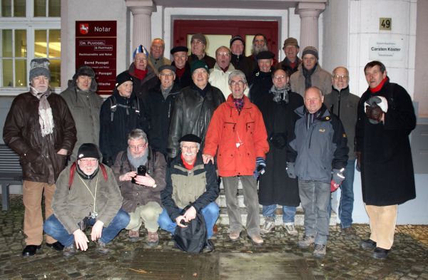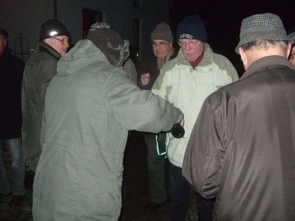Fast pünktlich um 17:35 Uhr wurde das traditionelle Gruppenbild vor der Sparkasse gemacht, und dann begann der Marsch ins Ungewisse, denn der Organisator Manni hatte, wie in jedem Jahr, weder Marschroute, noch Zwischenstopp und Lokal vorher bekanntgegeben. Der Weg führte Richtung Bahnhof, links der Bahn weiter in Richtung Bierden und bei der Fleischerei Warmer über die Landesstraße. Bei klarem Wetter informierte Harry über den Stand der Sterne (bekanntlich sein zweites Hobby) und wurde auch mit humorvoll gemeinten unqualifizierten Fragen gelöchert.