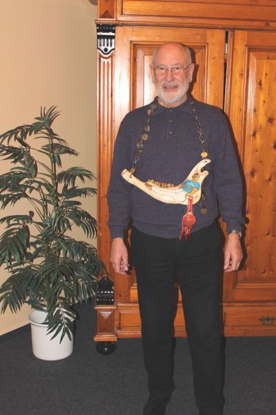 Endlich zogen sich die bisherigen Kohlkönige zurück, um den neuen König 2012 zu ermitteln. Die Wahl fiel nach kurzer Diskussion auf einen EUMEL, der seit ca. 35 Jahren dabei ist und regelmäßig die Sportabende besucht. Gerd schlenderte mit launigen Worten durch die Runde und erwähnte dabei, wie sich ein künftiger Kohlkönig verhalten haben sollte bzw. wie er zum Sport/Turnen steht. Wichtig ist natürlich auch, dass er beim Kohl-Essen mit Messer und Gabel umgehen kann. Alle lauschten gespannt seinen Worten, bis er endlich Horst Fischer unter Beifall der Anwesenden das Zeichen der Würde, die Kette mit dem Knochen, umhängte. Horst bedankte sich für die "hohe Auszeichnung" und bestellte sofort eine Runde "Roten" und versprach, in diesem Jahr ein würdiger König sein zu wollen, wofür er von Harry den obligatorischen EUMEL-Tusch bekam.