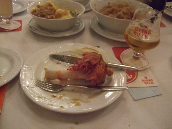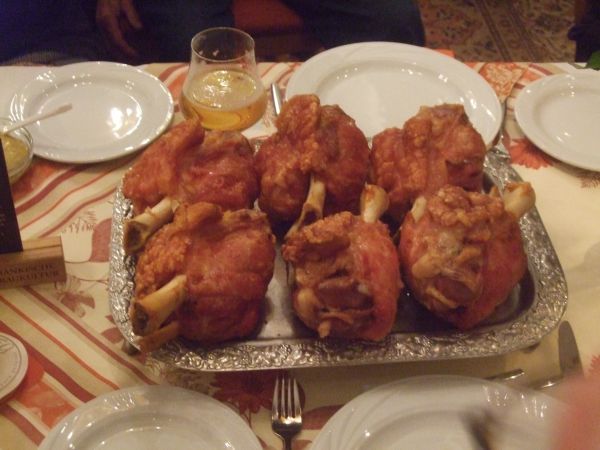 Nachdem auch einige Lieder angestimmt waren und ein paar lustige Döntjes erzählt waren, wurden die Haxen aufgetragen, denn nach dem ersten Bier hatten alle einen entsprechenden Appetit. Die Zubereitung ließ, wie immer, keine Wünsche offen und daher trat Ruhe ein, denn jeder war mit seinem Essen beschäftigt. Es soll auch einen gegeben haben, der eine zweite Haxe in Angriff genommen hat, dann aber nach dem Verzehr der Schwarte aufgeben musste. Für das abschließende Eis mit heißen Kirschen war aber bei allen noch genügend Platz im Magen. Nach dem Verdauungsschluck ging es ans Bezahlen und für die meisten Teilnehmer wurde die vorher organisierte Heimfahrt angetreten. Wie bereits in den Vorjahren ließen es sich neun Teilnehmer nicht nehmen, den Heimweg wieder auf Schuster`s Rappen anzutreten, Respekt, Respekt.