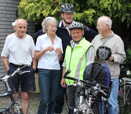Die Fahrt ging zunächst an der Bahn entlang Richtung Bierden, durch den ersten Tunnel am neuen EDEKA-Markt vorbei bis zu Klaus-Peter Stobbe in Bierden. Mit großem Hallo wurden Klaus-Peter und seine Frau Erika bei einem kurzen Zwischenstopp begrüßt. Die Fahrt ging dann weiter Richtung Achim, durch das ehemalige Bauernviertel zur Mühle und in Uesen zur Weser, wo uns Annemarie unter der Flutbrücke mit der bereits erwähnten „Stärkung" erwartete. Jürgen Scheler, der am Vortage seinen 74. Geburtstag feierte, lud zusätzlich noch zu einem kleinen Umtrunk ein. Nach der "Stärkung" führte uns der Weg weiter zum ehemaligen Oelhafen, und dann mussten die Räder in einem "Gewaltakt" über die noch bekannte Treppe den Hang hinauf geschoben werden. Die älteren Teilnehmer kamen dabei doch ganz schön aus der Puste.