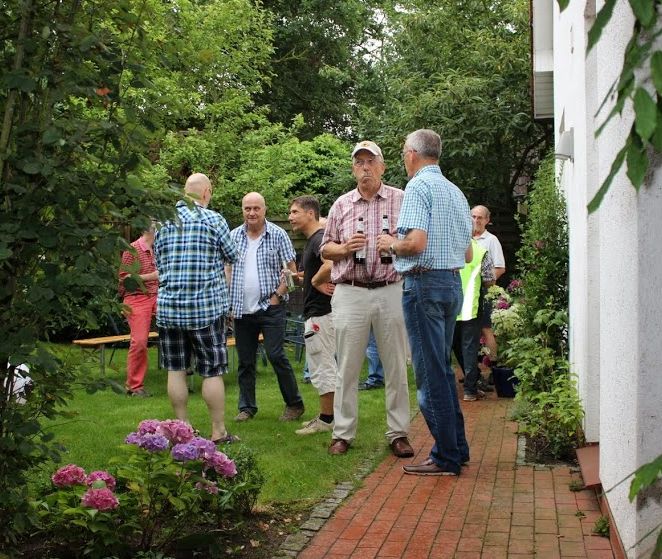 Die Fahrt ging dann weiter durch das Badener Lahhofgelände Richtung Etelsen, dann Richtung Kanal und anschließend rechts ab wieder Richtung Baden. Über den tollen neuasphaltierten "Weserhang" ging es weiter nach Uesen, bei der früheren Gastwirtschaft Schäfer den Berg hinunter und etwa unterhalb der Mühle wurde in die Straße Am Reitplatz eingebogen. Die erstaunten EUMEL wurden schnell aufgeklärt, denn dort wohnt Torsten Frenz, der am Freitag seinen 53. Geburtstag feierte und uns zu einem Umtrunk einlud. Mit seinen nunmehr 53 Jahren gehört Torsten natürlich noch zu den JUNGEUMELN. Torstens Frau und Töchter hatten in der Garage alles liebevoll hergerichtet, und die EUMEL brachten nach der inzwischen ca. 17 km langen Fahrradtour auch den entsprechenden Durst und Appetit auf die angebotenen "Knabbersachen" mit. Die Tour hätte auch bei Torsten schon enden können, denn die EUMEL fühlten sich bei der tollen Bewirtung sehr wohl.