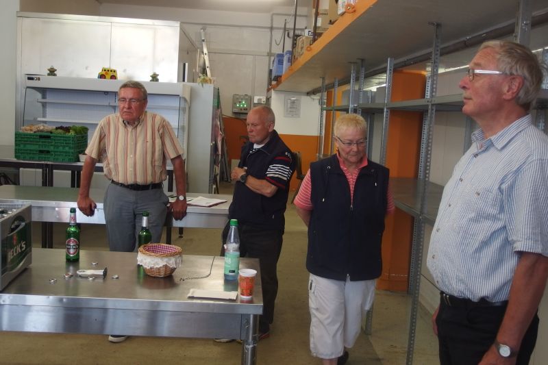 Dort erwarteten uns Harry und Annemarie mit dem Chef der Tafel Herrn Rainer Kunze. Harry erklärte dann, dass die diesjährige Betriebsführung von Herrn Kunze in Form eines Vortrages über die Entstehung und Arbeitsweise der Tafel erfolgen würde. Annemarie hatte leckere Schmalzbrote vorbereitet, die zum ebenfalls bereitstehenden Bier hervorragend mundeten. Herr Kunze begann dann mit seinem Vortrag, indem er über die Gründung der Tafel vor 9 Jahren, die organisatorischen Anlaufschwierigkeiten und die Arbeitsabläufe wie Ausstellung der Berechtigungsausweise, Abholung der gespendeten Lebensmittel von den Firmen, Sortierung der Ware bis hin zum Verkauf berichtete. Besonders erstaunt waren wir, dass ca. 120 ehrenamtliche Personen für die Tafel tätig sind, und dass pro Monat etwa 50 Tonnen Lebensmittel umgesetzt werden. Auf die Problematik bei der Bedienung der Flüchtlinge wurde besonders hingewiesen. Herr Kunze verstand es, durch klare und verständliche Ausdrucksweise die anwesenden EUMEL in dem ca. einstündigen Vortrag einen Einblick in die selbstgestellten Aufgaben der Tafel zu vermitteln. Harry bedankte sich im Namen der EUMEL für den interessanten Vortrag mit 2 Flaschen Wein.