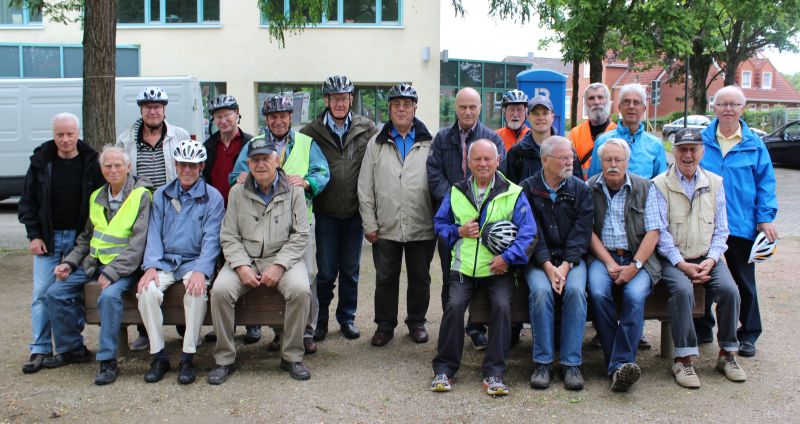Einen Tag früher als im letzten Jahr fand unsere traditionelle Radtour vor den großen Ferien statt. Gegen 17:30 Uhr versammelten sich (trotz Stadtfestbeginn) 22 EUMEL auf dem Baumplatz und nahmen für das obligatorische Gruppenbild Aufstellung. Harry übernahm dann das Kommando und führte die Gruppe durch das ehemalige Bauernviertel, über Bierden, Bollener Dorfkrug (ohne Einkehr) Richtung Uphusen. In Höhe des Elli-Sees begann es dann erstmals nur etwas zu regnen. Während der anschließenden Weiterfahrt erwischte uns aber in Höhe des Krankenhauses ein ordentlicher Schauer, der dazu führte, dass einige EUMEL wie begossene Pudel aussahen. Die Weiterfahrt ging dann durch den Bahntunnel der Bruchstraße, Achimer Bruch, "Vogelsiedlung" über den neuen Kreisel bis zur Feuerwehr.
