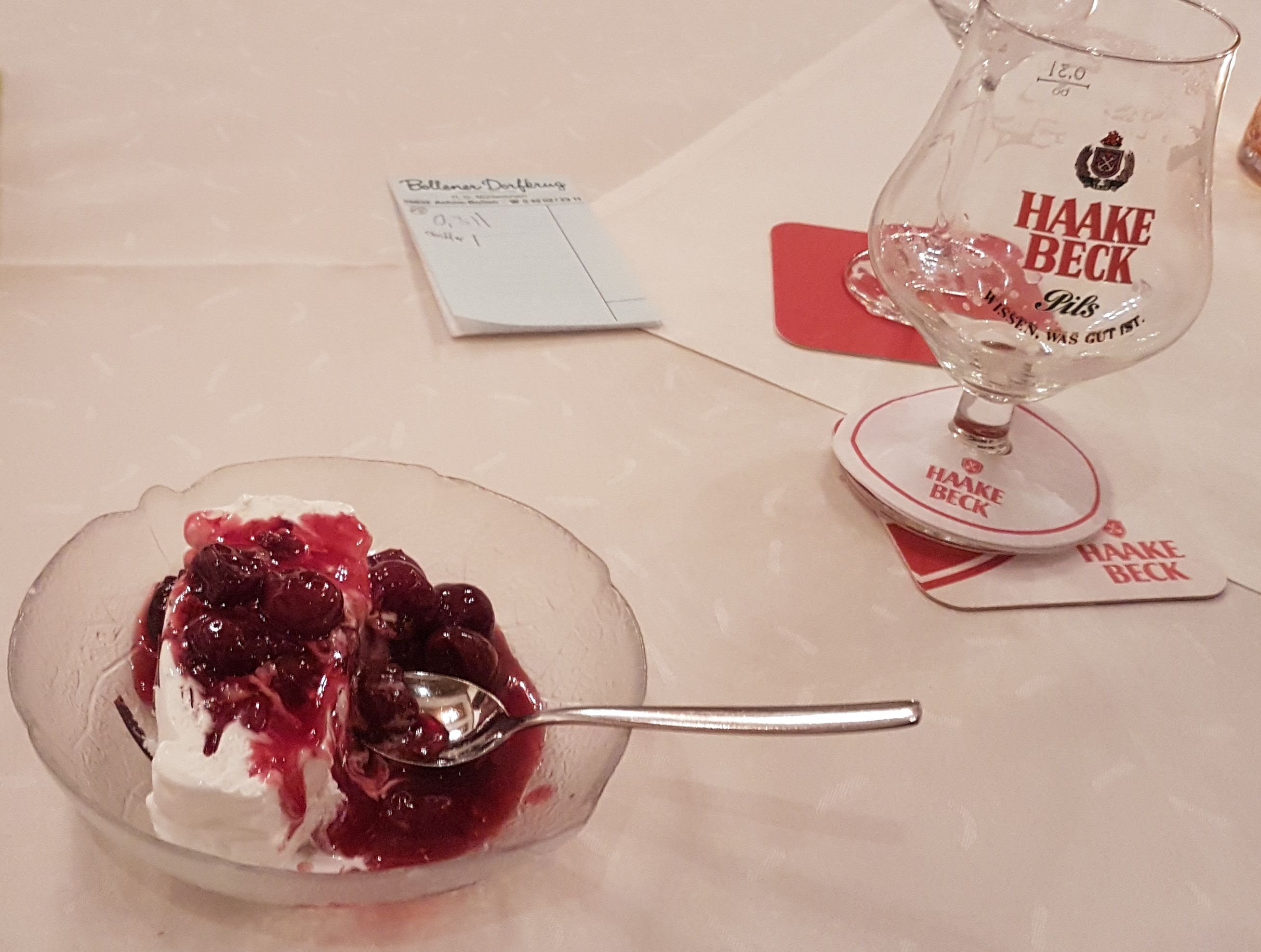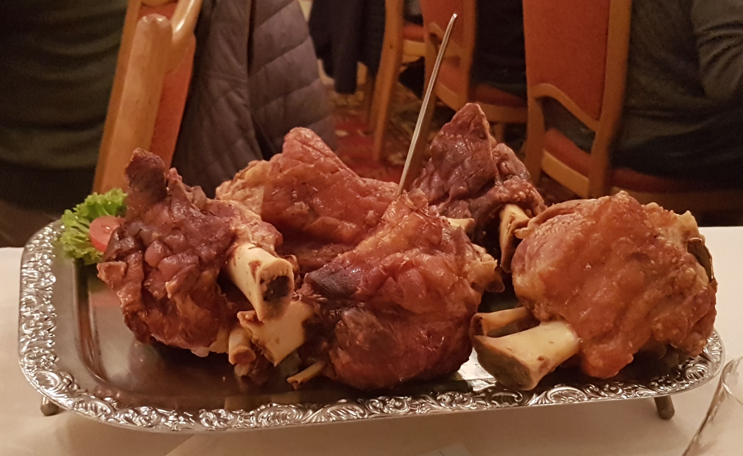Mit einem Vortrag „Watt ist Watt" trug Heiner auch gleich zur Erheiterung der Runde bei. Das Lied „Ein Heller und ein Batzen" wurde kräftig von der Gruppe mitgesungen, und anschließend erzählte Siegfried in seiner unnachahmlichen Art 2 Döntjes in ostpreußischer Mundart. Danach wurden die Haxen aufgetragen, die Gespräche verstummten, und jeder Einzelne konzentrierte sich mit Heißhunger auf sein Essen.