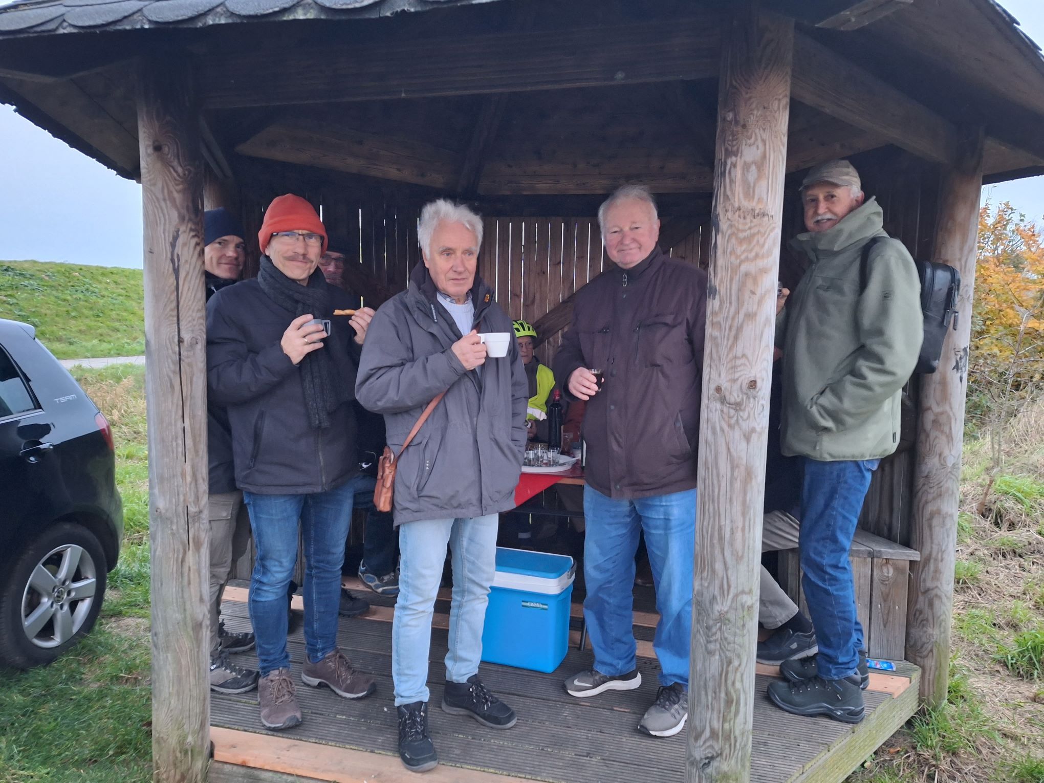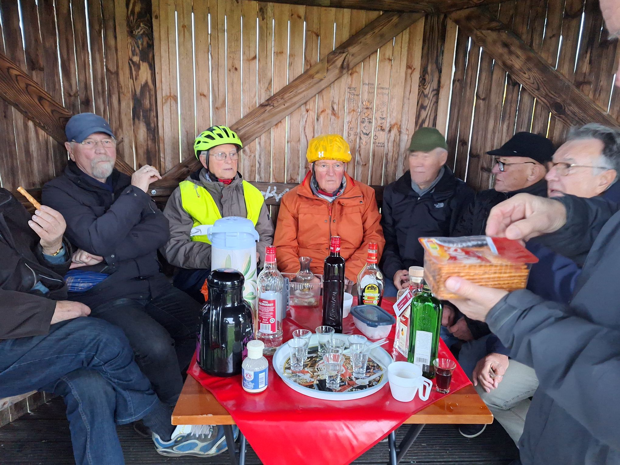 Heiner Ellmers, der Organisator, war auch zur Stelle und versorgte uns mit Treibstoffen in Form von Flaschengeist wie Feigling zum Beispiel. Nach einem Startschluck und dem Gruppenfoto ging es los. Heiner traf dann die Vorbereitung für den Zwischenstopp bei der Rundhütte am Deich kurz vor Clüverswerder. Unser Weg hatte mehrere Kurven; sie konnten nur mit Zielwasser (Schlehenfeuer oder Saurem) geschafft werden. Bei angeregter Unterhaltung und Blödeleien ging es flott weiter. Wir erreichten gut gelaunt den Zwischenstopp; einige Radfahrer stießen zur Wandergruppe.